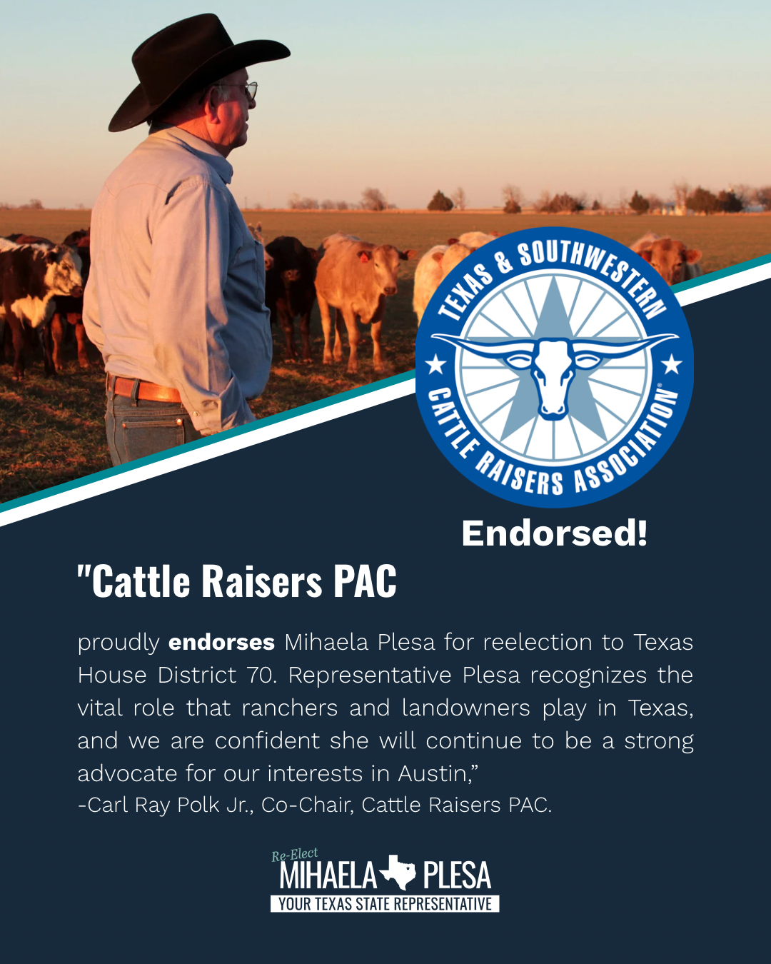 Proud to kick off the year with the Cattle Raisers PAC endorsement. My focus remains practical: water infrastructure, property rights, market transparency, and rural–urban collaboration that strengthens the Texas economy. #TxLege #TSCRA #HD70 #CollinCounty