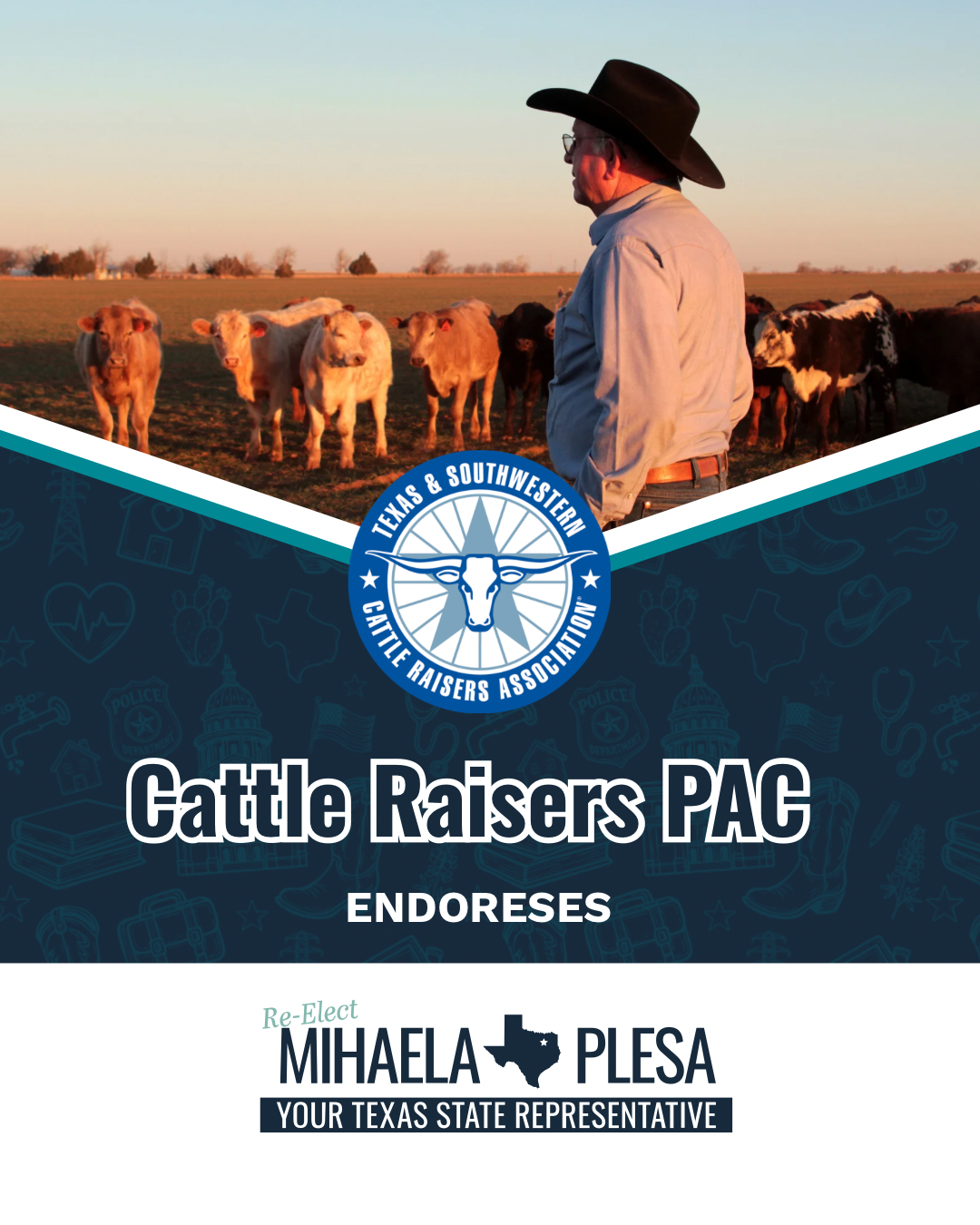 From pasture to plate, reliability matters! “Representative Plesa recognizes the vital role that ranchers and landowners play in Texas, and we are confident she will continue to be a strong advocate for our interests in Austin.” — Carl Ray Polk Jr., Co-Chair, Cattle Raisers PAC What that means for ...Read more