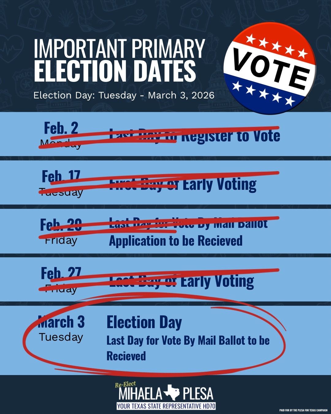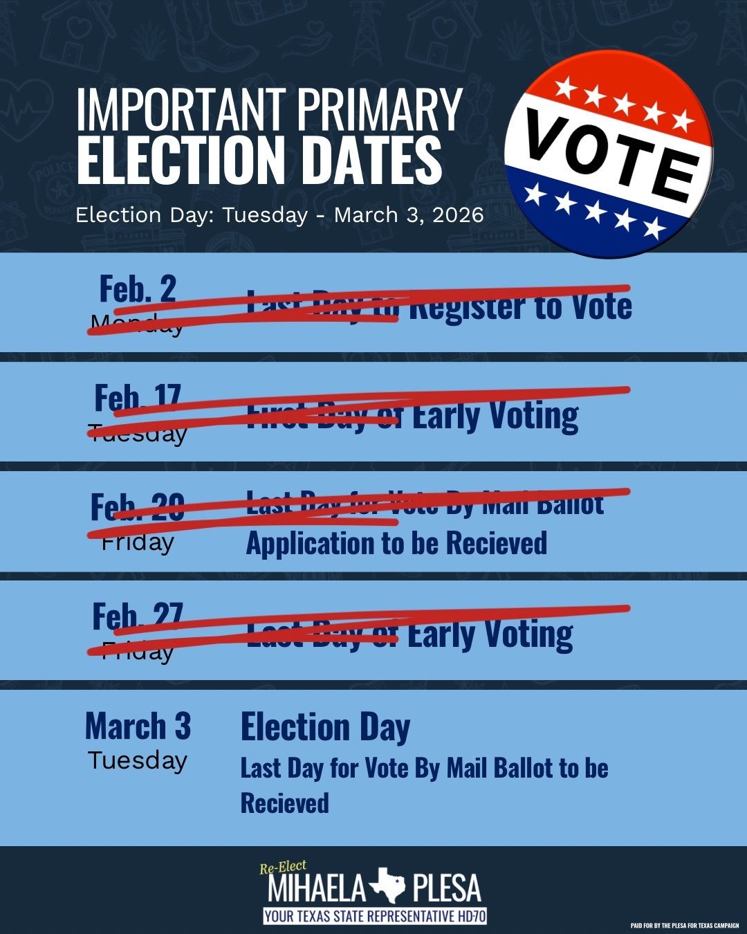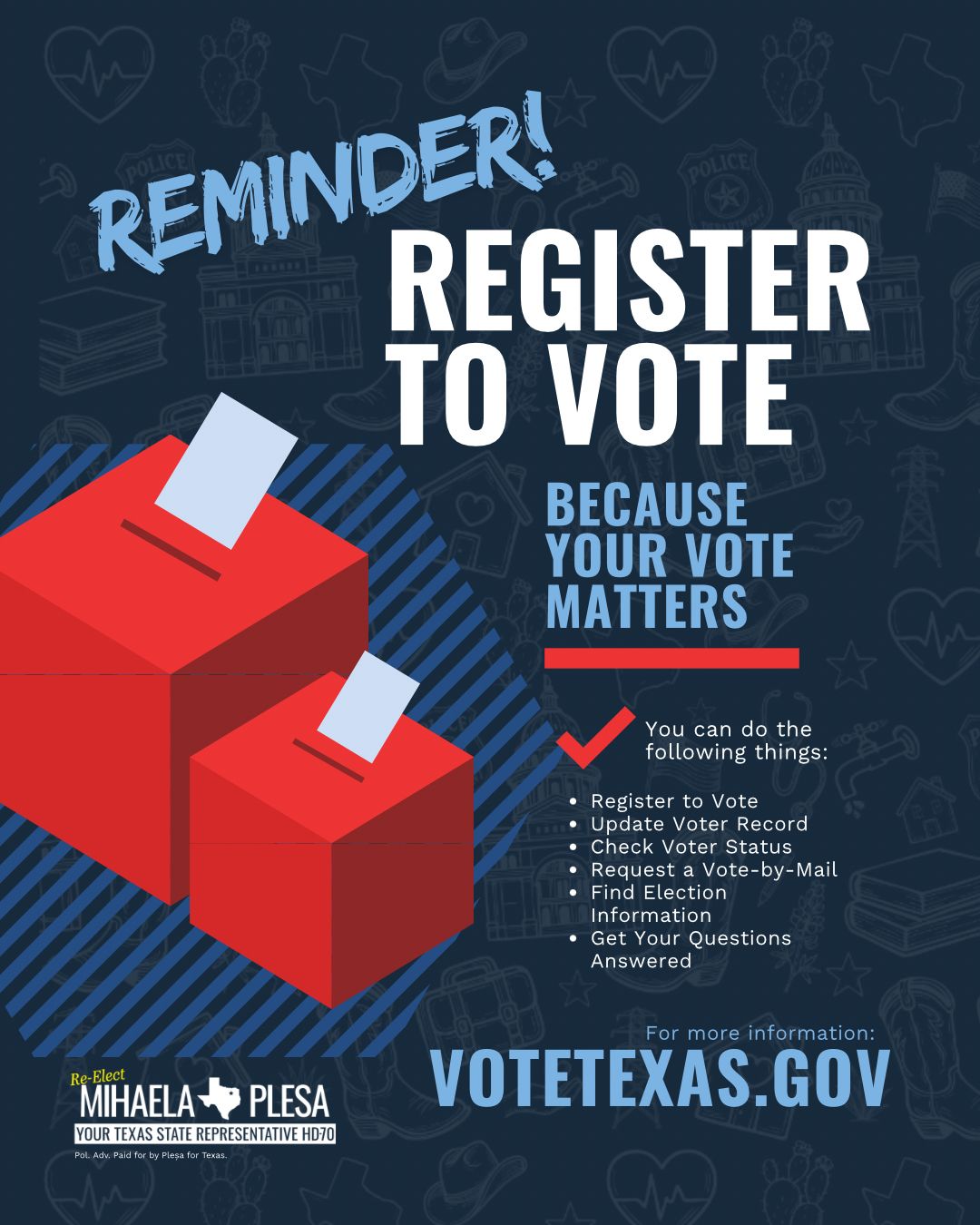 🗳️ Your voice matters! Make sure you’re registered to vote in Texas and have the info you need to make your voice heard. From checking registration status to tracking your ballot, VoteTexas.gov has everything you need. ✅ #TexasVotes #HD70 #GetInvolved #YourVoteCounts